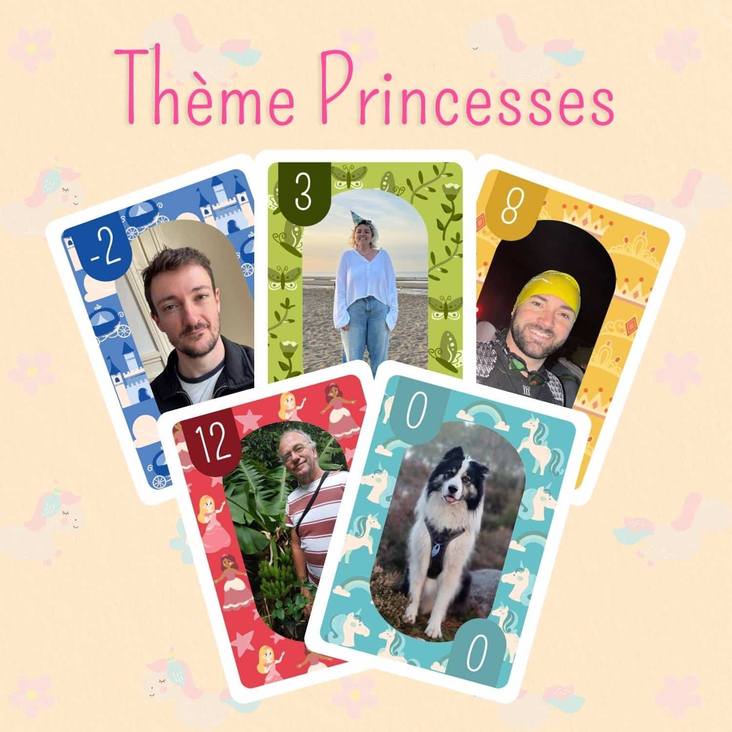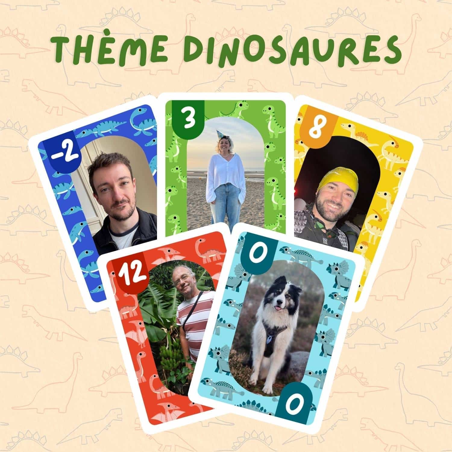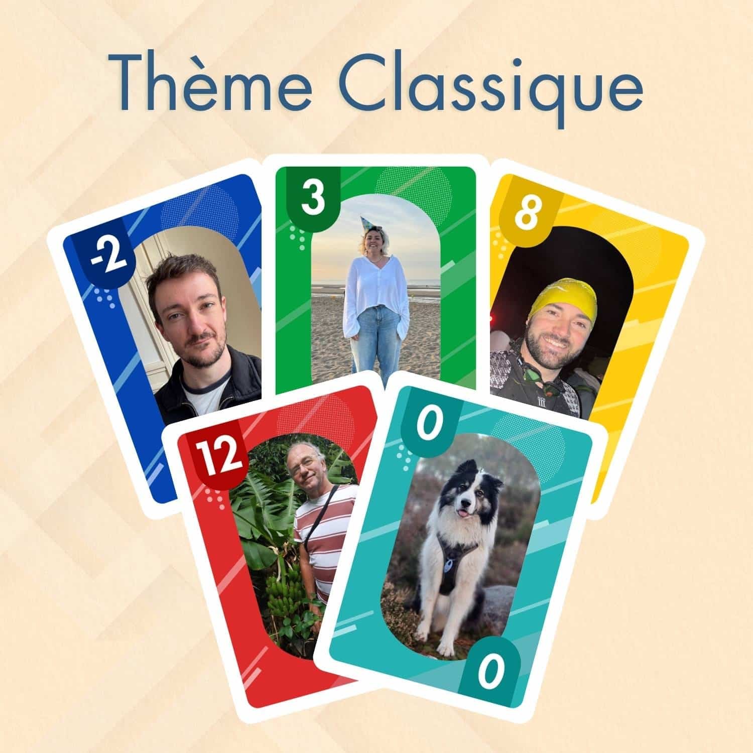 150 cartes personnalisées avec vos photos ! Dans ce jeu, chaque valeur de carte correspond à une photo différente : une photo pour toutes les cartes -2 ; une photo pour toutes les cartes -1 ; une photo pour les 0 ; une pour les 1 ; une pour les 2 … et ainsi de suite, jusqu’aux valeurs les plus hautes.