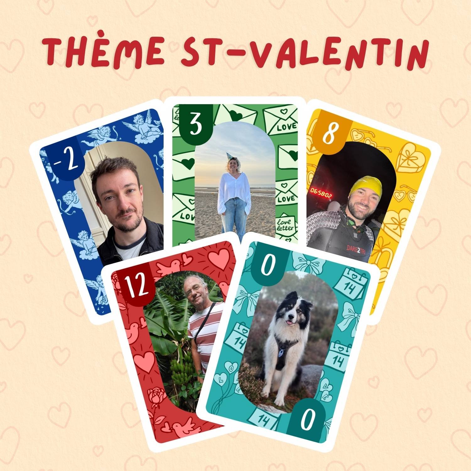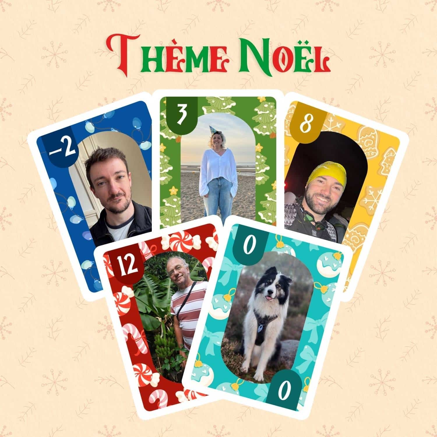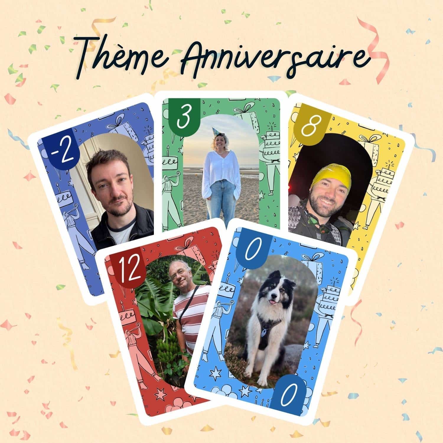 150 cartes personnalisées avec vos photos ! Dans ce jeu, chaque valeur de carte correspond à une photo différente : une photo pour toutes les cartes -2 ; une photo pour toutes les cartes -1 ; une photo pour les 0 ; une pour les 1 ; une pour les 2 … et ainsi de suite, jusqu’aux valeurs les plus hautes.