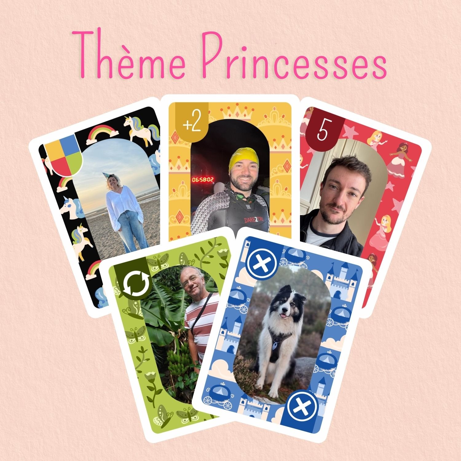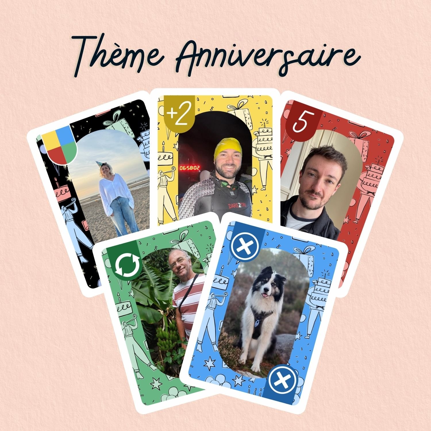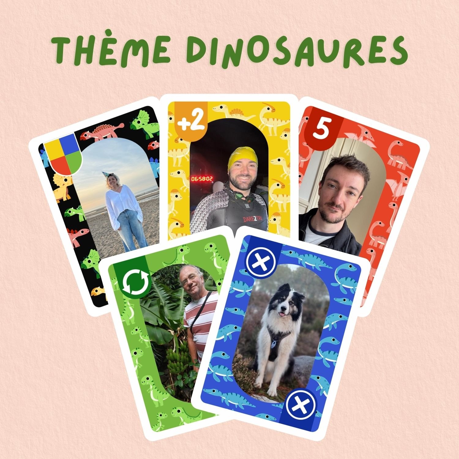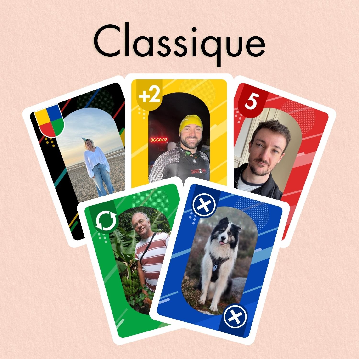 108 cartes personnalisées avec vos photos ! Dans ce jeu, chaque symbole ou valeur de carte correspond à une photo différente : une photo pour toutes les cartes +4 ; une photo pour toutes les cartes +2 ; une photo pour toutes les cartes changements de sens ; une pour les 0 ; une pour les 1 … et ainsi de suite.